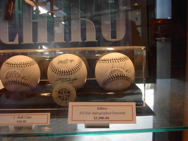 選手のサイン入りボールが売られていました。最高値はイチローのサイン入りボール1000ドルです。誰がこんな金、出すんだろうか...