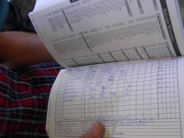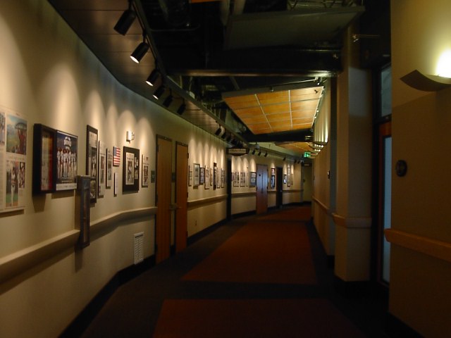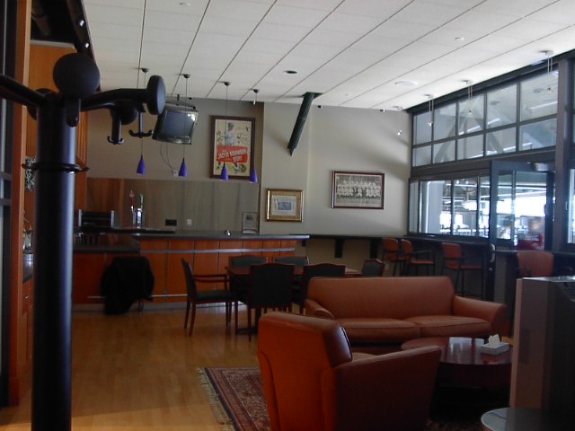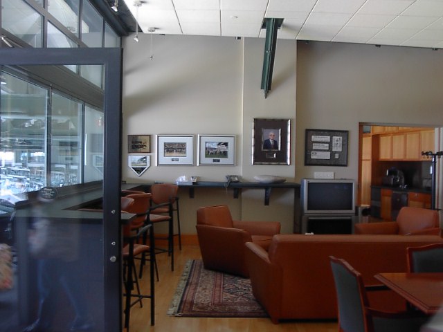 ま、とりあえず、バックステージツアーで球場を見てみることにしました。セーフコフィールド内野最上段辺りからの眺めです。海と、シアトルのダウンタウンが一望できます。とてもいい場所にある球場です。 球場のVIPが試合を見る個室のあるフロアです。球場全体がそうですが、とても綺麗でした。これまで見てきた球場、例えばYankee Studiumとか、Wrigley Fieldとかからは想像も出来ない綺麗さです。向かって右手が観戦する部屋があります。左側にはマリナーズの歴史を紹介する写真がギャラリーをなしていました。 そのうちの一つはこんな感じです。イチロー、MLBデビュー当時の様子です。決勝打をうってチームメイトにhugされています。 これはマリナーズ・オーナーの部屋です。任天堂社長、山内オーナーです。真ん中に写真がありますね。広さは日本で言う30平方mくらいではなかったかと思います。 部屋のつくりは思ったよりもシンプルでした。が、場所は当然ですが一番いい場所でしたね。ま、オーナーですから当然か。 続いて記者席です。平素、各Mediaの方々がここで試合を観戦して記事を書いているはずです。場所は非常にいい場所でオーナーの部屋の一階下です。キャッチャーの真後ろ。役得ですね。 記者さんの席の後ろの荷物置きのところには記者さんの仕事道具がそのまま置いてありました。選手のデータブックとか、試合のスコアーブックとかです。写真はスコアブック、記者さん、きちんと仕事してますね。 記者席はキャッチャーの真後ろで、結構高いところにあるためか、記者さん達を守るネットはありません。時に真後ろにとんだファールボールは凶器になる違いありません。記者席の一部には壁がへっこんでいるところがありました。あぶねーな。 ちなみに記者席からの眺めはこんな感じです。 それにしても球場としては非常に新しいのが印象的でした。芝生はとてもよく手入れされていて美しい緑です。