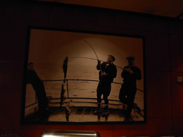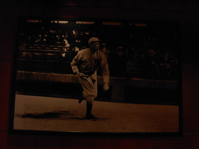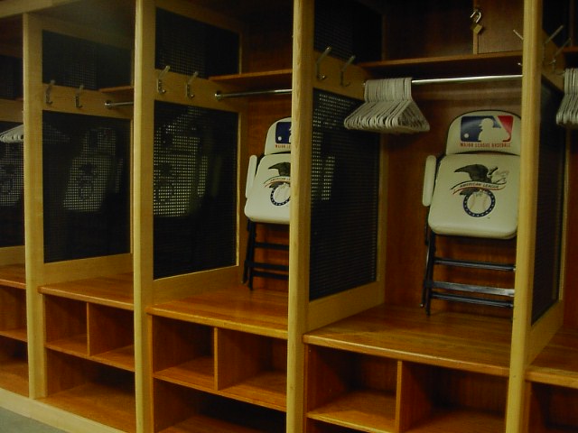 ちなみにKentucky Blue Grassだそうな。これは年間予約席を取った人達が入れる部屋です。プレミアムルームとかいうらしいです。ちなみに年間予約席はマリナーズホームの試合80の席を最低100〜150ドル/試合くらいから購入できるそうです。日本円で100万円くらいですからそう滅茶苦茶に高いわけではないですね。 その部屋にはいくつかのコレクターズアイテムらしき写真が大きく飾ってありました。これはベーブルースがピッチャー時代の写真で これは球場では犬猿の仲として知られているベーブルースとルーゲーリックのツーショット写真です。釣りを一緒に楽しんでいるところですが、それでも犬猿の仲ですから、ひじょーに珍しい写真だそうな。 ここは試合後にインタビューが何時も行われるはずの場所です。イチローの平素のインタビューも、契約更新時のオーナとの握手もここでやってきたはずです。 これは選手のロッカーです。これはマリナーズの相手チームの奴。マリナーズの奴は見せてくれなかった。(個人の荷物が置いてあるから見せるのは無理らしい)非常にシンプルなつくりです。この場を手に入れるためにどれだけの選手ががんばってきたことか。