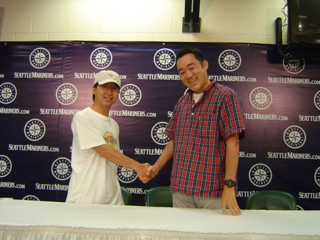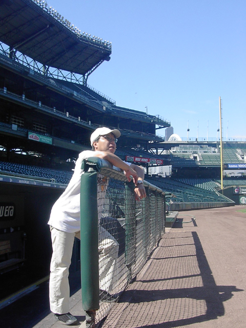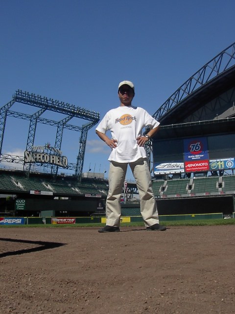 と感じさせられてしまいました。なんだかんだ言っても、やっぱしプロの球場はとても雰囲気があって来て見てよかったと思いました。なんだか、球場に立っている... そんな感じでtemporaryに球児ぶっています。 ここはマリナーズサイドですから、ここで何時もイチロー、長谷川、(佐々木)等がウロウロしている(いた)はずです。 かつて小学生時代に町内野球をやってたころのことを今さらのように思い、胸が少々熱くなりました。野球というのはやっぱし人の心をつかむものだ、そう感じました。