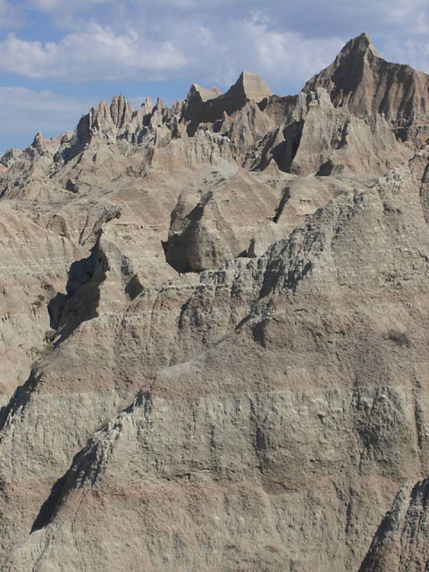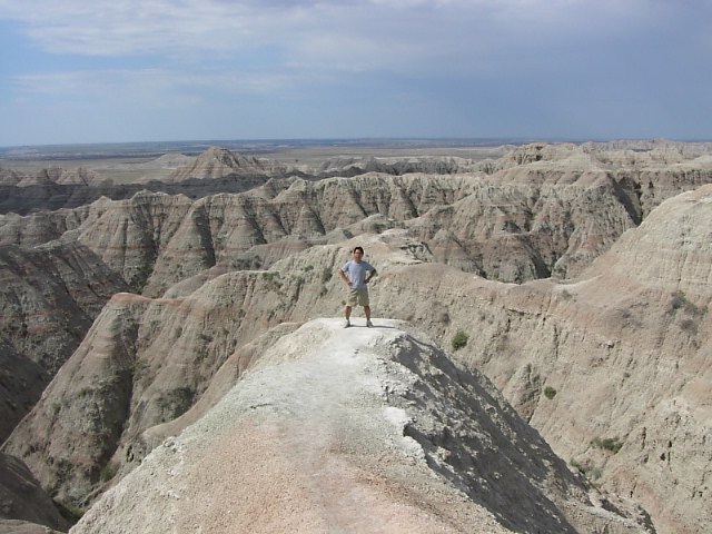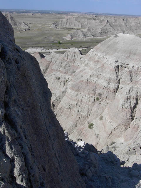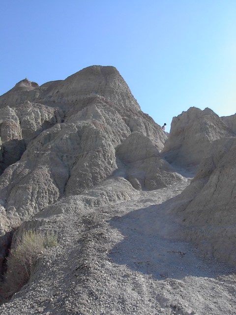 山の一つの上のほうに上るとそれなりにいい景色を楽しむことは出来ました。それにしても、このトレイルは危なすぎるな。トレイルは延々つづいているけれど、こんなとこでバックカントリーには、あんましでたくない、と思わせる世界でした。それゆえにBadlandsといわれるのであれば大納得してしまうくらい危ない場所です。 |