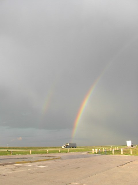 でも、美しい虹も見れました。ここで見た虹は凄かった。地平線の端から端まで180℃の視界に広がる広大な虹。完全に半円状でした。そして見ている間に虹は2重になったんです。(解りにくいですが写真の通り) |