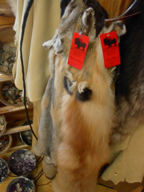 目立つところではキツネの毛皮。とてもフサフサしていて気持ちはいいのですが、キツネの耳、鼻がそのままついているので少々生々しすぎ。でも、これがたったの80ドル少々。 |
