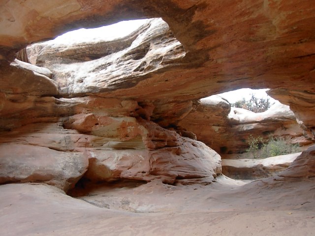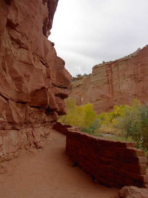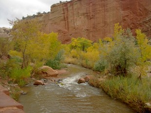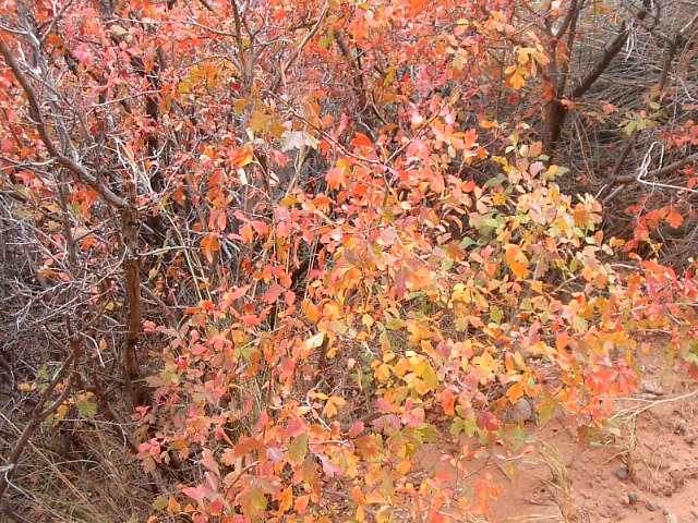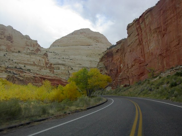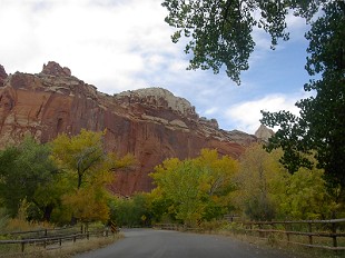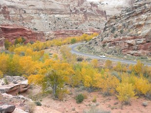 ま、でもアーチならこの場所の東300キロ彼方のアーチーズ国立公園に嫌というほどありますから、これも此処だけのものではないです。この場所の見所はもっと別にあります。さらに紅葉(黄葉かな?)を目にしながら別の場所に入ります。 |