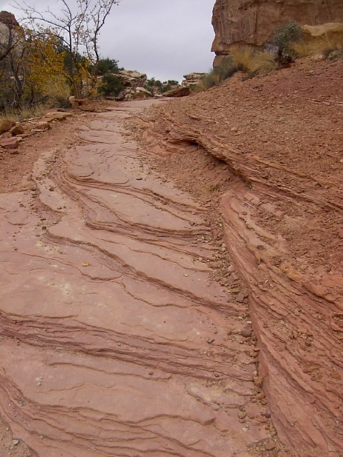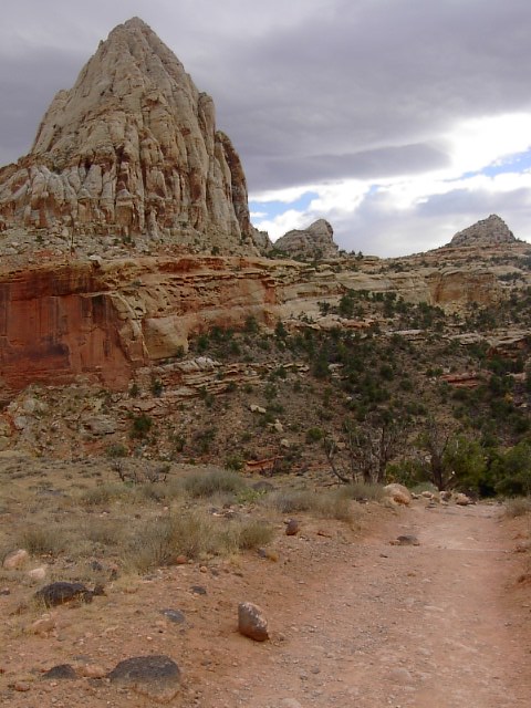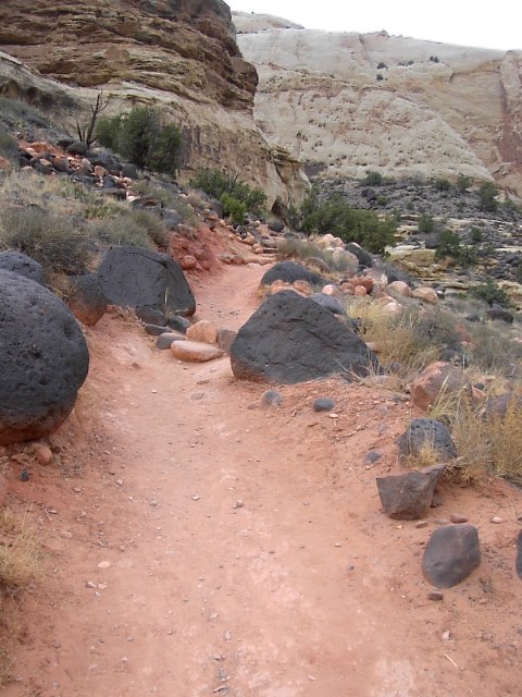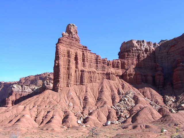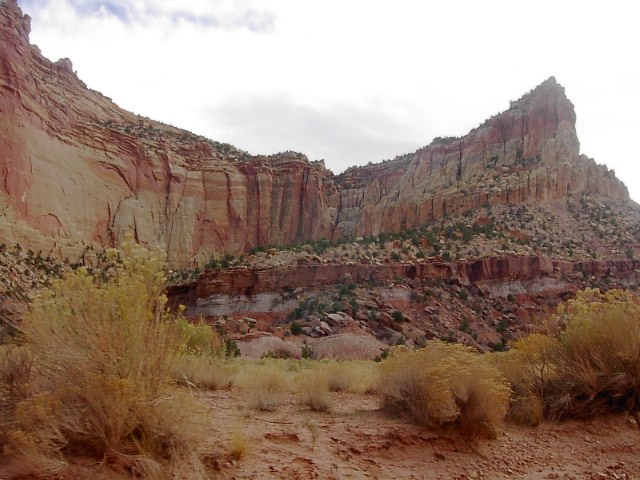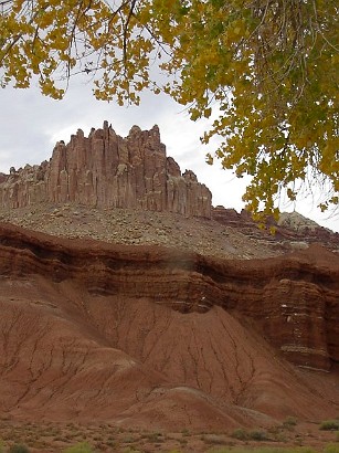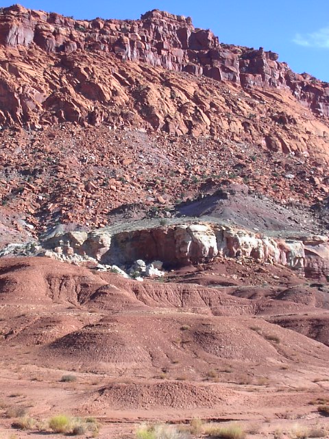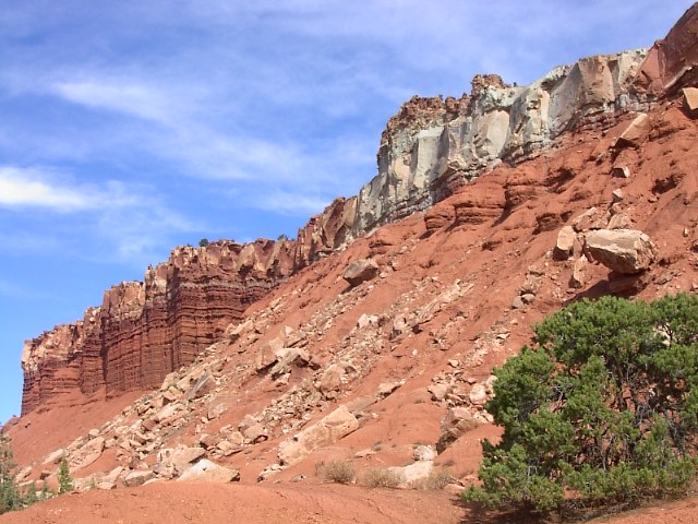 Capitol Reefでもっともよく見かける景色はこんな感じの岩の屏風です。この岩の屏風の下の方には写真のように風化されて崩れていく石、砂の斜面があります。 |