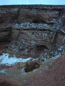 赤いむき出しの岩の世界、砂漠。暑い場所と思うかもしれませんね。しかし、季節は冬。劇寒、極寒の世界です。水なんかガチガチに凍ってます。軽く氷点下でこの日は確か-5℃くらいだったかな。 |