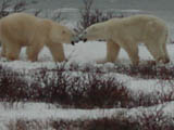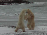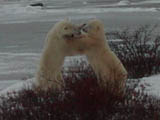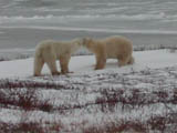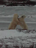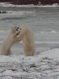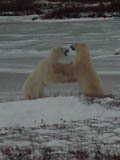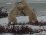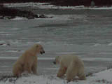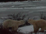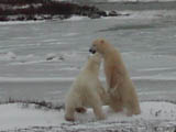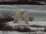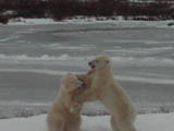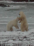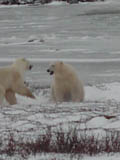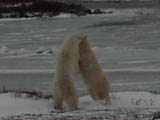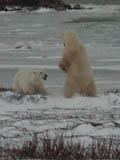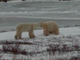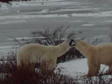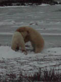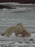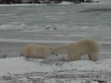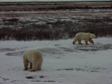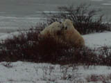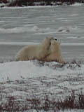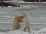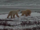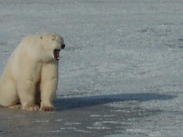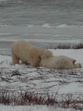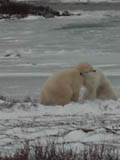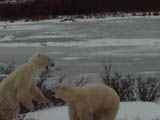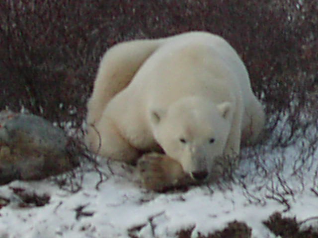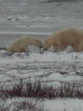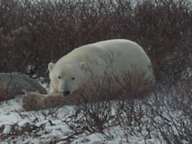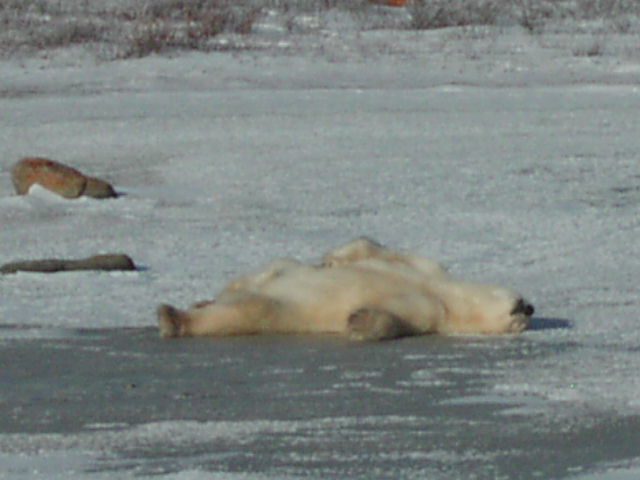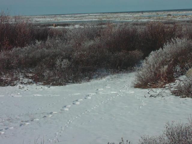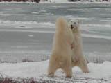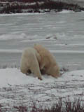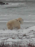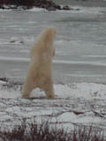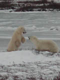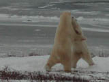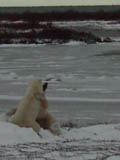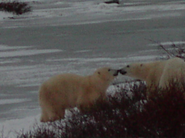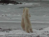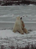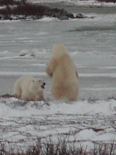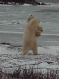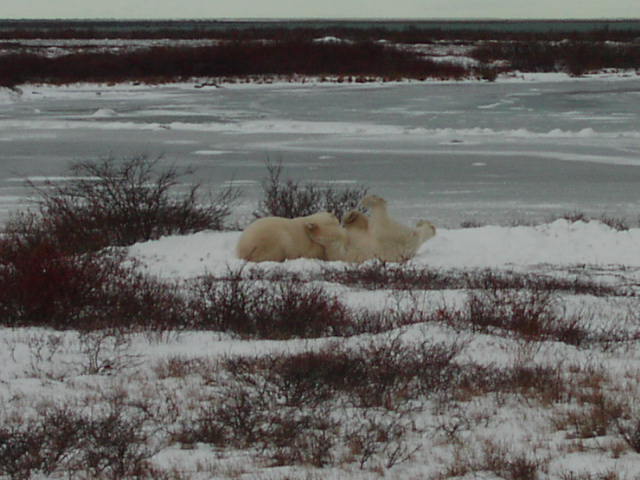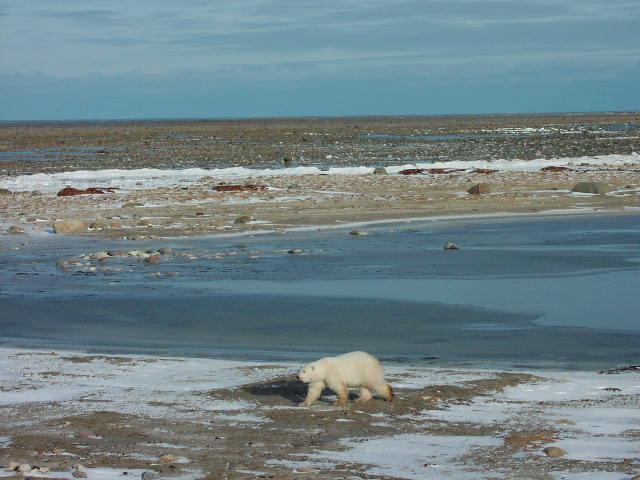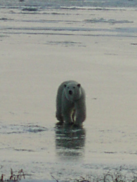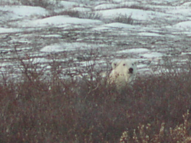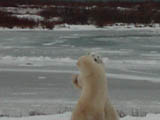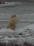 白熊はそのことを知っていて餌のとりやすい流氷を生活の主たる場にしているのです。ちなみに夏場はこのあたり流氷は完全に溶けますので白熊にとって夏は餌をとるのに非常に苦労するのです。ですから白熊は夏はかなり飢餓状態。早く流氷のできる冬を楽しみに待っているのです。その流氷がChurchill沖合いから出来始めるので白熊たちは一刻も早く流氷に行き着きたいが為にChurchillに集まってきて、流氷を待つのです。Churchill沖合いで流氷が出来はじめるのが10月中旬から11月の上旬なのでこの時期がBestなのです。この場所ではその時期のことをBear
