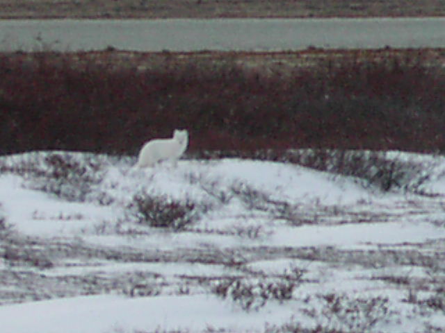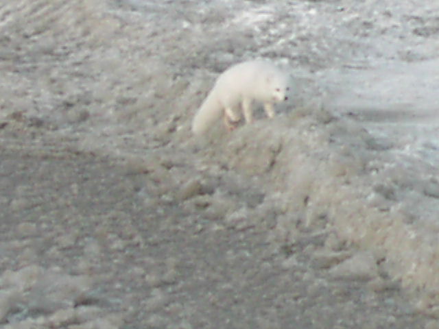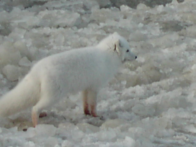白熊と同じですが本当に見事なまで真っ白です。とても可愛らしい奴でした。このキツネ、人、バギーを知らないらしく、すぐ傍で氷をほじくり回してました。なにか食べ物を隠していたように見えました。これまたとても可愛らしいしぐさだったのを思い出します。 |