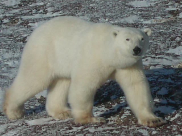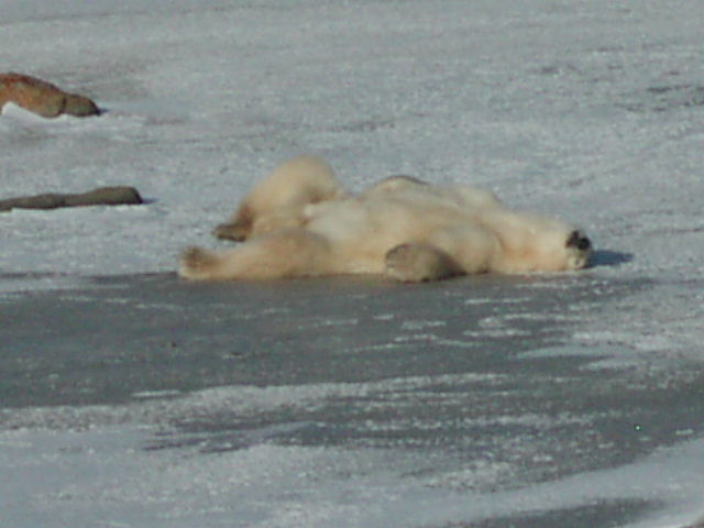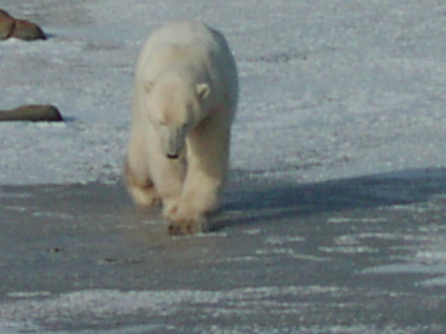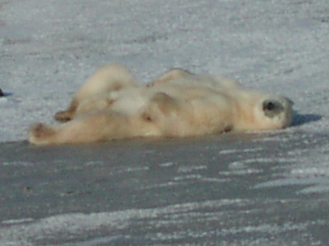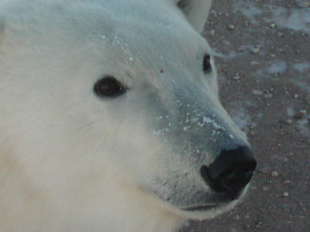 これがこの旅行中のBest Shotでした。実際には自分の真下まで来て背伸びしてきましたので、その距離1mなかったと思います。特に怖いとかそういう感情は全くなかったのですが、ドキドキしてカメラもつ手が震えたのを思い出します。白熊とは不思議な力を持っているようです。 |