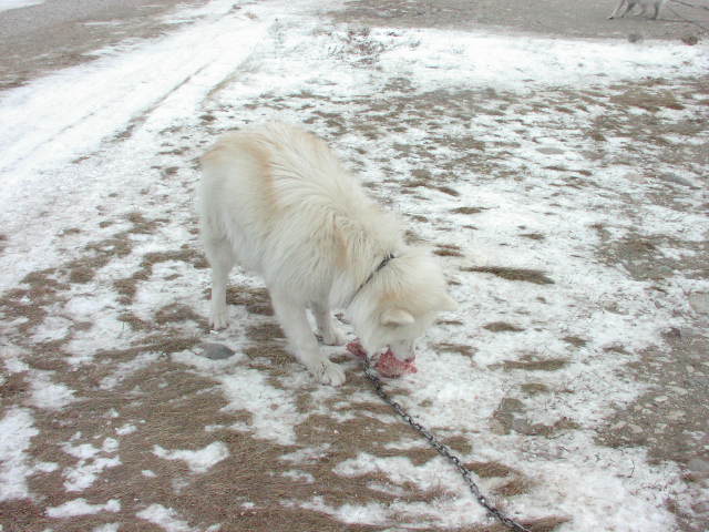 Tableで知り合いました。自分が食事していた時にお酒飲んでいて話をし知り合えたんです。この方、実に凄い人でした。世界の半分のカナディアン・ハスキー犬をひとりで全て面倒見ています。これは餌やりの光景です。トラックに肉の塊を大量に載せていて、それを斧で切って細かくしこれをこいつらに与えていくんです。実に豪快です。 |
