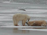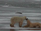 前のがメス、母親で後ろのがその子供です。体格が違います。ちなみに普通、子供は一回の出産で2匹生みます。そして子供のうち最初の一年を越せるのは約30%くらいなのだそうです。特に夏場はアザラシ等が簡単には取れないのでそこが彼らのとって鬼門なのです。この母親も一匹の子供を亡くしたのでしょう。 |