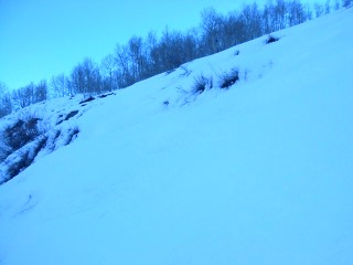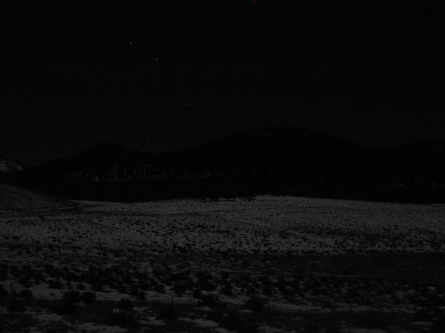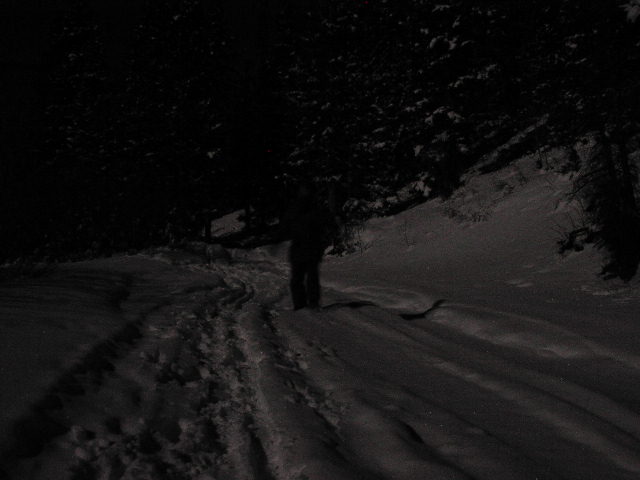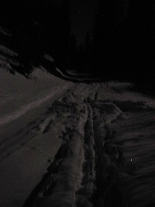 すっかり日が傾いてます。真っ暗になるのも時間の問題でしょう。しかし昨晩同様、この日も満月だということがわかってました。ライトなしでも見えるくらいに雪の世界は明るくなるのです。でも、一応、強力なヘッドランプもって出発。ちょっとだけSnow