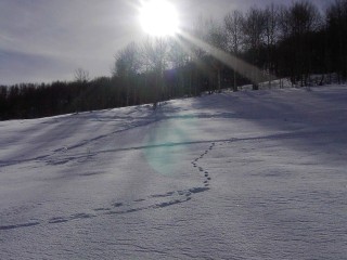 まず、広大に広がる銀世界を目にしてクロスカントリーへ。凡人は本でサラッと見ただけのクロスカントリー素人以前のレベル、机上の空論しかもちあわせていません。クロスカントリーなんか体が知らない世界です。ま、できる、できないはどうでもいいんです。やってみる、試してみるだけのこと。 |
