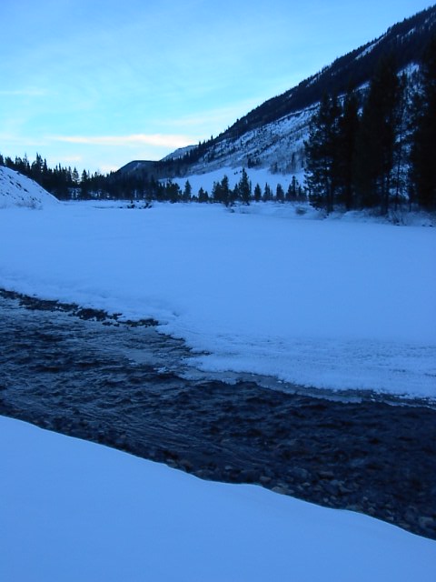 やがて、日が沈んでしまいました。トレイルから見下ろすと下に方に川が流れています。これだけ寒いのに凍りつかず、勢いのいい流れです。 |