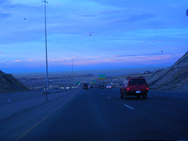 mountainsにいます。写真はI-70上でロッキー山脈側からデンバーの側を眺めた光景です。デンバーの町、その向こうには広大なプレイリーが地平線の彼方まで広がっています。ロッキー側で山の中を散々運転した後、突然に広大な平原が果てしなく目の前に広がるとジーンと感動します。地球を見ている、と実感するのです。 |
