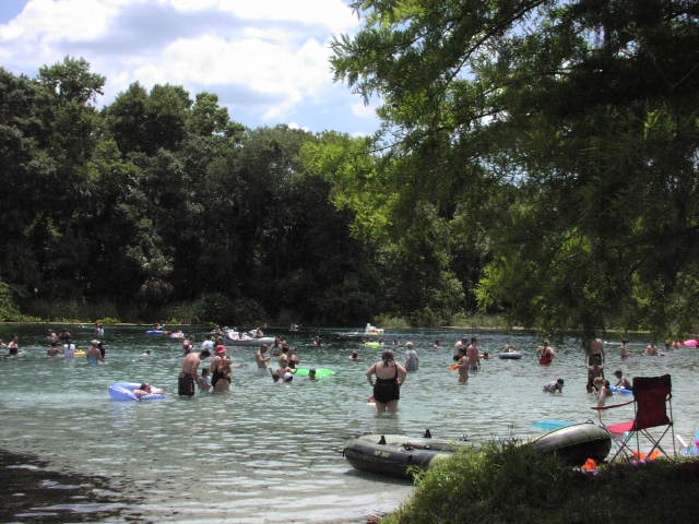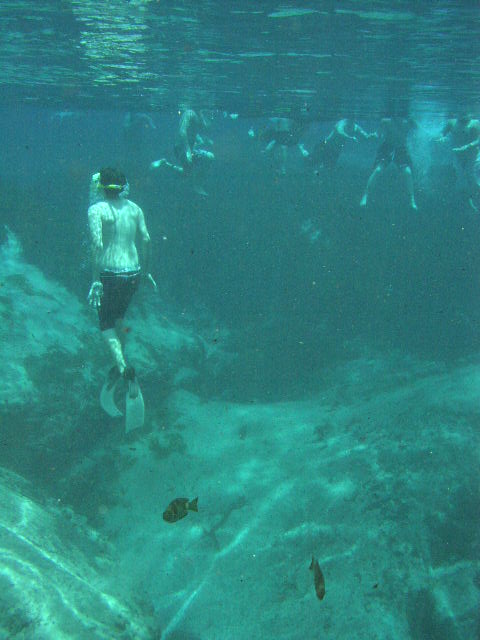 実に深さ20mはあります。自分は泳いでいるかぎり溺れはしない程度の自信はありますから泳いでましたが、それでも急にぽっかりと口をあけた巨大なAlexander SpringsのSpring Headには怖い感じがしました。それくらい深いのです。この10mくらい離れた周辺の場所は1mくらいの深さで一般の人たちが皆泳いで楽しんでいます。そこに急にこんな場所があるんです。しかも何の管理もなされていなくて『自己責任だよ』とそれだけです。さすがに深いのでスキューバダイビングしてる人が何人かいました。 |