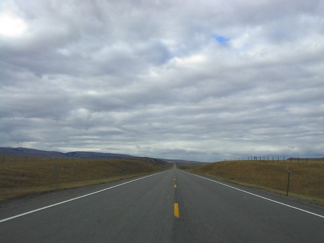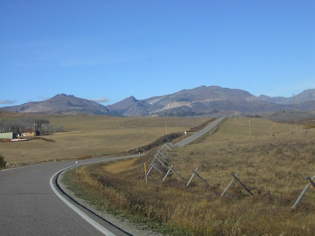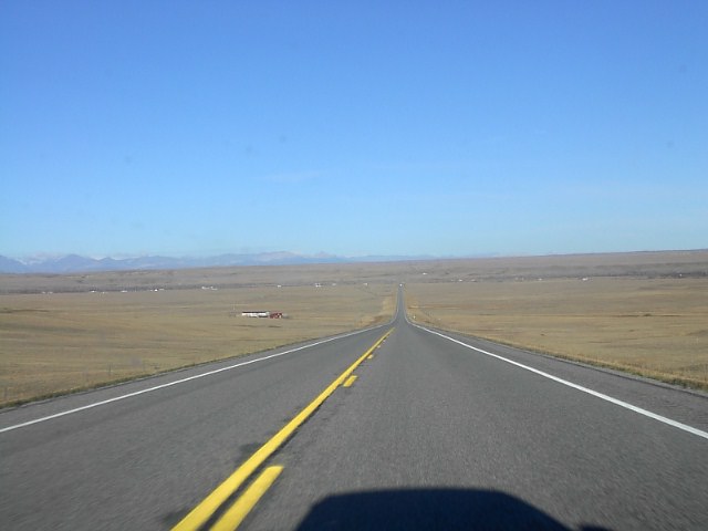 ワイミングから連続15時間ほどの運転でモンタナの北部に入りましたが、道路の真っ直ぐさ、大地の平坦さは胸のすく思いのするくらいのもんでした。北部に行くにつれ、左手(西側)にロッキー山脈が延々と連なり、ロッキー山脈沿いを縦走するまたとない機会を味わいました。90マイル/時 |