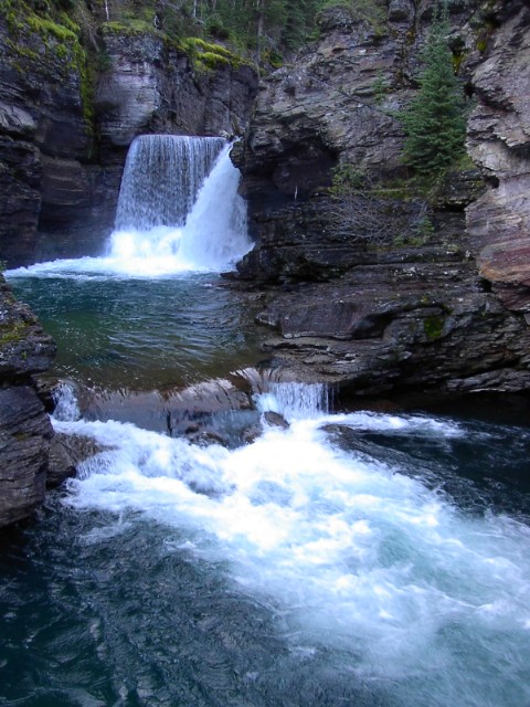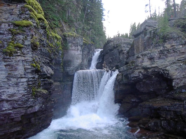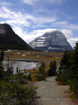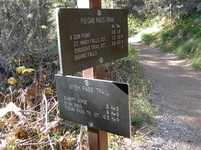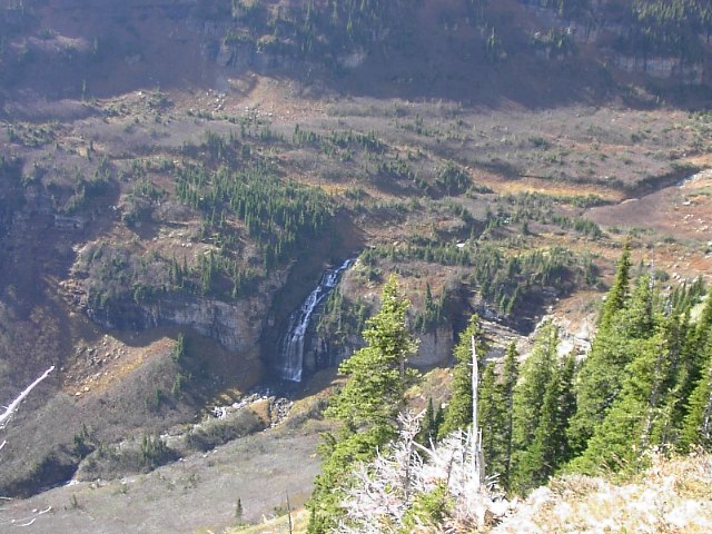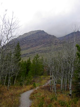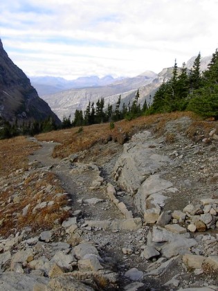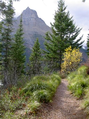 このSt. Mary湖の東の端の方に巨大な滝があって、その脇からトレイルがSt.