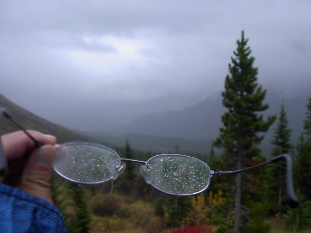 雨が降り始めたんです。撤退の条件のひとつとして雨を考えていました。というのは、雪に変わる可能性がある(十分な防寒具がない)、雷がいつ襲撃してくるかわからない、トレイルが泥だらけになって走れる状態ではなくなる、という状況を意味するからです。一旦ぬれたメガネは体温で容易に曇りメガネかけると先がよく見えなくなるような世界でした。悪条件には悪条件が重なるものです。 |