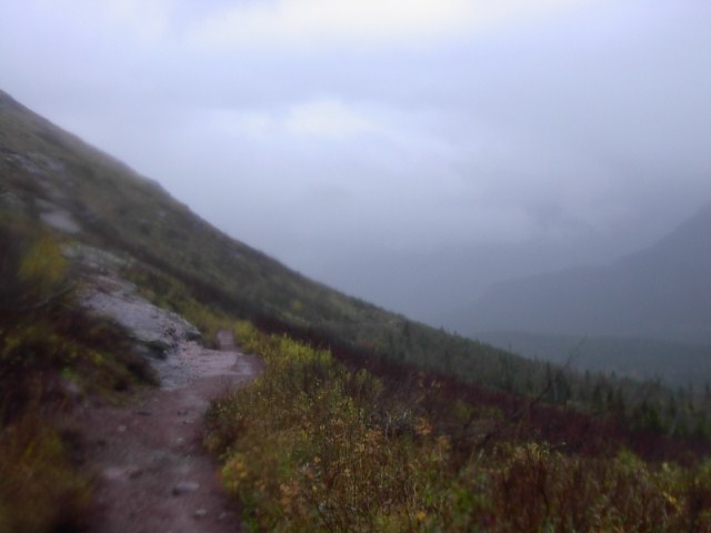 撤退途上、トレイルは雨で濡れてました。周囲は雨が霧のように舞い、景色は見通しの利かない状況でした。 |
