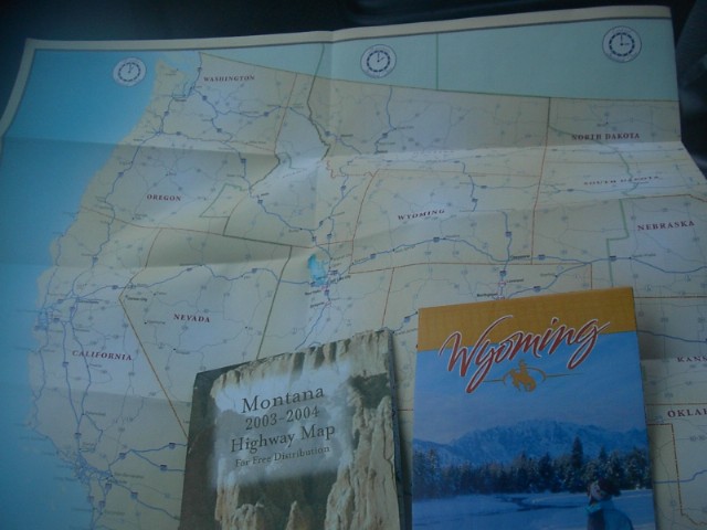 Lake Cityを拠点にして、南北にロッキー山脈を縦断し、果てはサンフランシスコまで行ってロサンゼルス方面へと南下しましたから、今考えれば結構な距離です。凡人愛車、ポンコツカローラ文句も言わずに付き合ってくれて感謝してます。ポンコツカローラの助手席には常にこの地図が広がってました。アメリカ全土図です。今回は特にロッキー北部へと移動してましたから中心となるモンタナ、ワイミング等の地図もちらちら覗きながらの運転となりました。 |