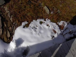 殆ど生物には出会いませんでしたが、途中、唯一ライチョウに出会いました。あとひと月もすると真っ白になるのでしょう。少しだけこげ茶色の体に見える白い模様はその前兆かな?彼は凡人の前をしばらく急ぎ足で歩きながら振り返り、振り返りし、茂みの中に逃げ込んでしまいました。 |
