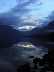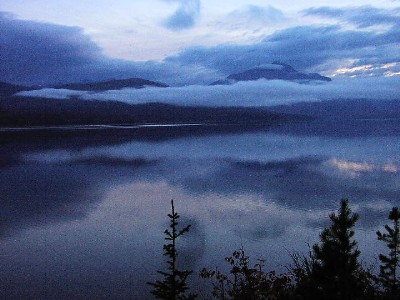朝方起きて、Lake McDonald際を散歩しました。日の出前、雲が低く垂れ込めた幻想的景色が今でも心に残ってます。 |