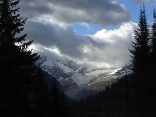 一帯はいかにも氷河によって削られたと思われるU字の形をした谷です。谷底は針葉樹林に優しく覆われていて静かな雰囲気に満ちています。ところどころ小さな白いところが見えます、これって多分これでも氷河なんでしょう。実に小さい... 氷河としてはアラスカのそれをも見た人には受け入れられない感じだな... 小さすぎて |