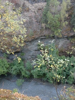 深い谷の底に美しい川が流れていました。そしてトレイル奥には滝があります。ちなみにこの川驚くほど綺麗で、時々、バチャバチャッと水が跳ねてました。