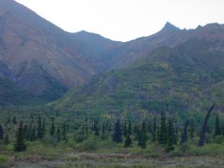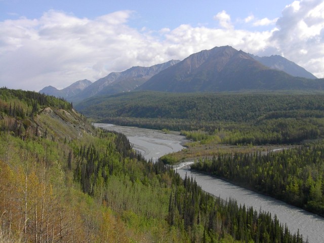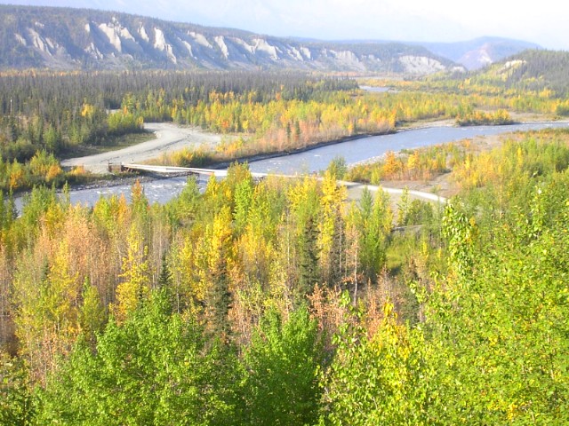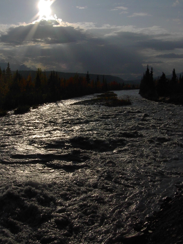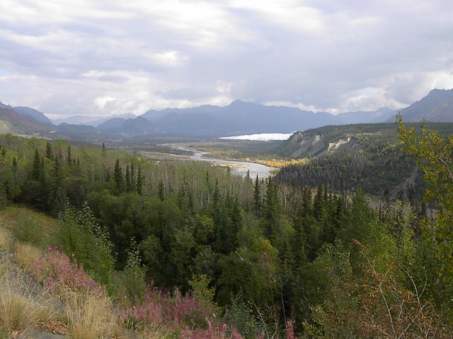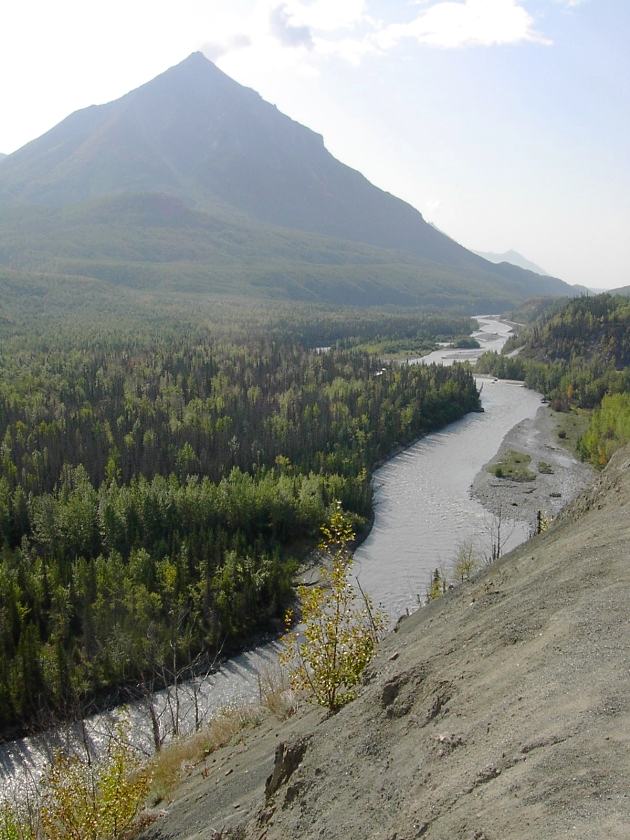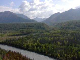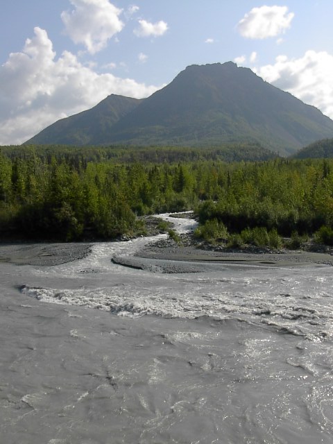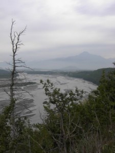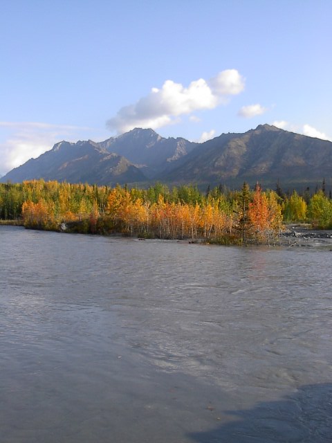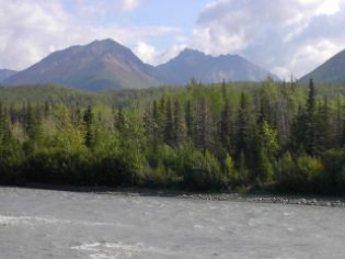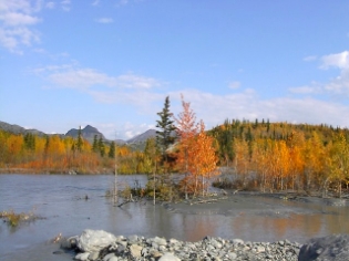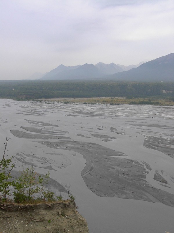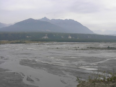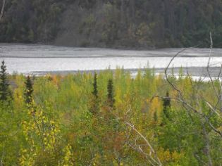 やがてアラスカらしい川が目の前に現れます。浅くて幾筋にも分かれた泥色の流れの急な川これがアラスカの川です。多くの川がこんな感じしています。 |
