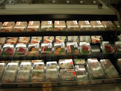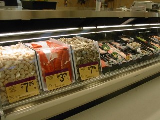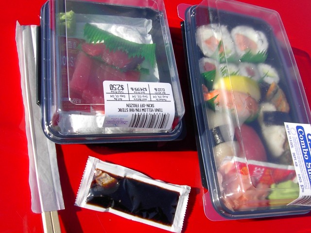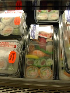 これ見つけた為に凡人はこの場所がアンカレジで最も感動的な場所となったんです。日本に住んでいると、こんなものなんとも思わないでしょうが、アメリカで新鮮な寿司がスーパーマーケットに置いてあるなんて驚愕ものなんです。Iowaなぞに住んでいて寿司なんて和食レストランにでも行かない限り食べることは不可能なんです。日本人の性、寿司についつい手が伸びてしまいました。(ちなみに滞在中、3回寿司買いに来ました。つまり、アンカレジに寄ったらとりあえずこのCarrsに来て寿司買った訳ヨ。) |