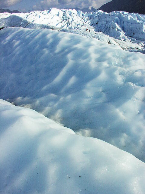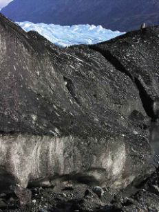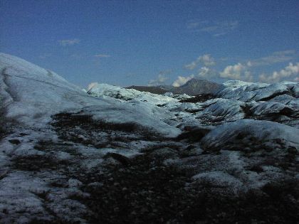 凡人、更に先に進みました。だんだん、表面を覆った泥が薄くなっていって自分が氷河の上に立ったことを実感し始めました。泥、というか細かな石粒が氷河、氷表面をびっしりと覆っています。石粒は氷に埋まりこんでます。きっと、沢山の人がココを歩いた結果こうなっているのだろう、などと都合のいいことを考えて先に進む勇気づけする自分の中の理由にしていました。 |