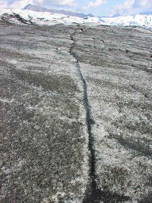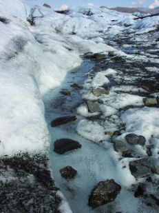 氷河表面は日の光に照らされてかなり溶けています。あるところでは大きな水溜りとなり、結構深そうです。また別のところでは氷河表面を川が流れています。異様な光景でした。 |