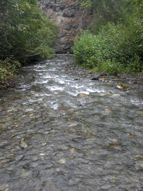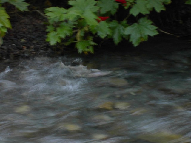 明らかに交尾、産卵の姿です。先に見た滝坪がすぐこの先にありますから、そこまであとちょっと、つまりこの場所はこの川の最上流なんです。鮭達はちゃんと知ってるんですね、ここが彼らが産卵すべき場所であると言うことを。やがて彼らは力尽きてその一生を終えるのでしょう。彼らのそういう姿、神々しい感じがしました。まったく、この場所にサーモンがいるなどと思ってなかったので意外であり、感動させられてしまい1時間ほど産卵光景をボンヤリ眺めていました。Bearスプレー握り締めて。サーモンはこの場所には本当に沢山いました。少なくとも30匹はこの一帯だけでも見かけたと思います。 |