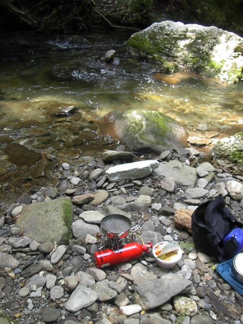 さて、その山の中に入って昼飯10分。小川を見ながらあっという間に済ませて。 |