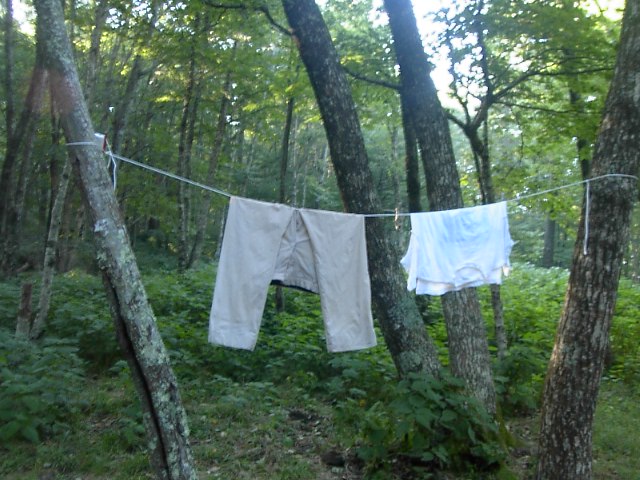目もくらむくらいがんばって歩きとおしましたので、シャツもズボンも汗でビショビショです。近くの小川で洗ってお洗濯♪