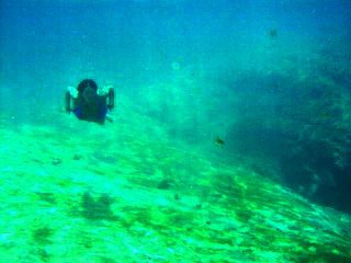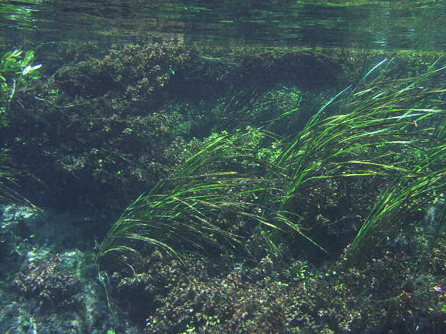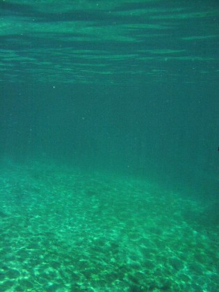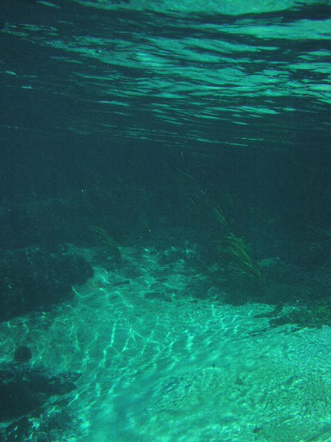 泉の70%くらいは足が届かない状態ですが、ま、その方がいいですね。足が届くと砂を巻き上げてしまい、泉の美観が損なわれるじゃろうから。こんな感じで泉の大半は敷き詰められた砂 |