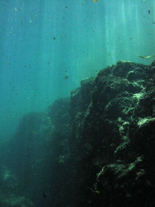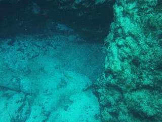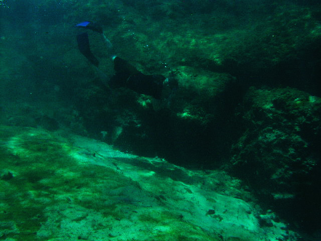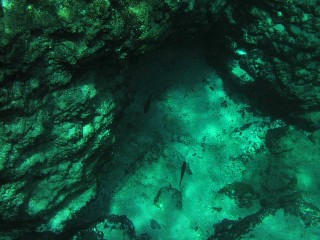 そして泉中心にの最深部辺りに岩場があって怪しい深いエメラルド色してます。写真にすると小さく見えますが深さは10mくらいだろうと思います。 |