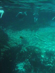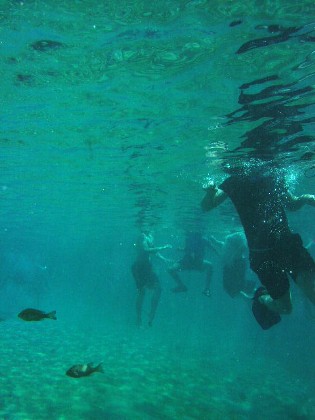 スノーケル、あるいはスキン・ダイブ、素潜りして楽しんでいます。ちょっと、人が多すぎてここはそれで駄目な雰囲気になってしまってますね。 |