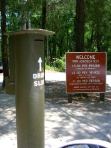 門を入るとそこに入場料を集めるレンジャーステーションがありましたが、人はいませんでした。3ドルを所定の封筒に入れて投函して入ってくれ、となってます。実に営利的でない感じが素敵です。 |