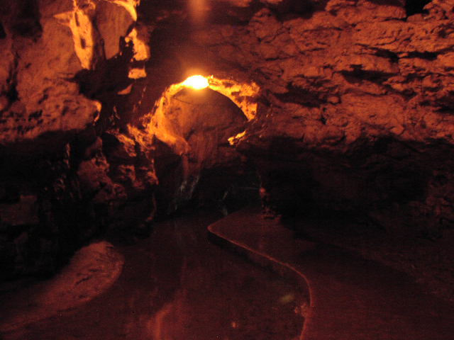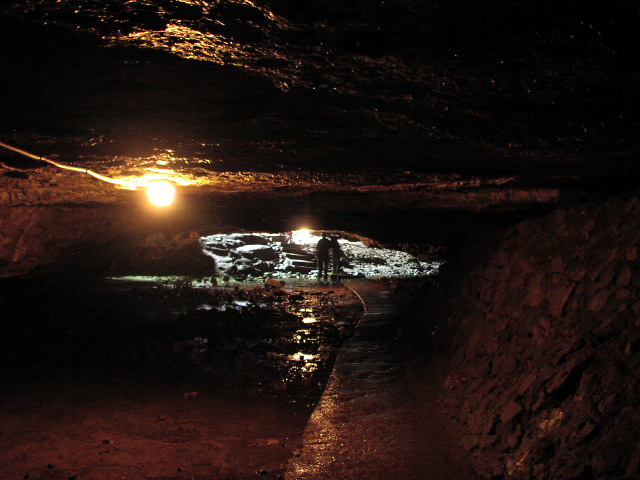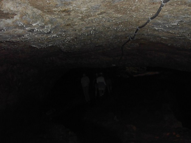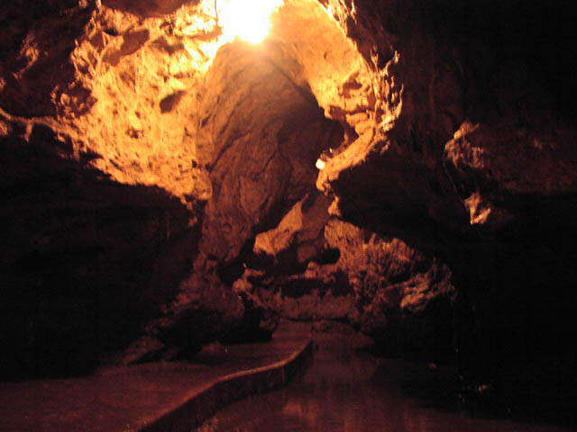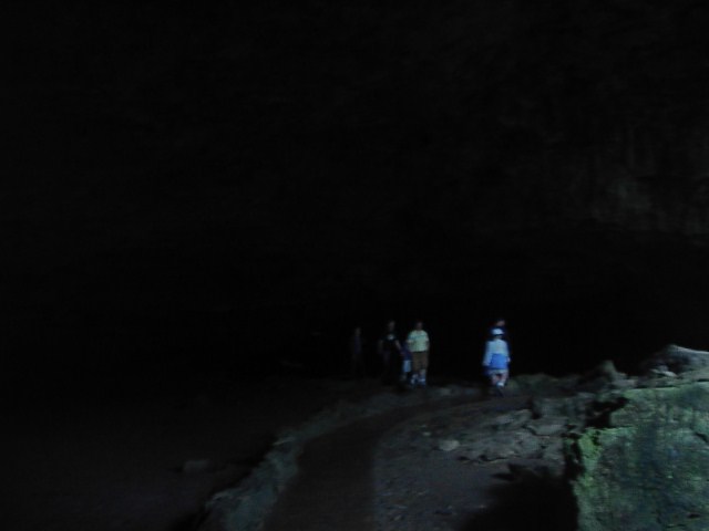 どんどん進むと洞穴はずーっと続いています。光のある場所は水が滴り落ちてて歩道以外は水でベチャベチャなのでそれを見やすくするためのものです。この電灯なけりゃ、懐中電灯のない自分も泥らだけは確実、そんな場所です。 |