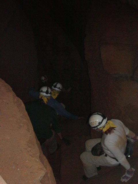 ところどころはとても狭いので1人づつしかとおれません。一人通過するまでこうやって待っておかなくてはなりません。今、先の方で一人が奮闘中です。 |