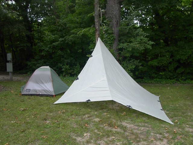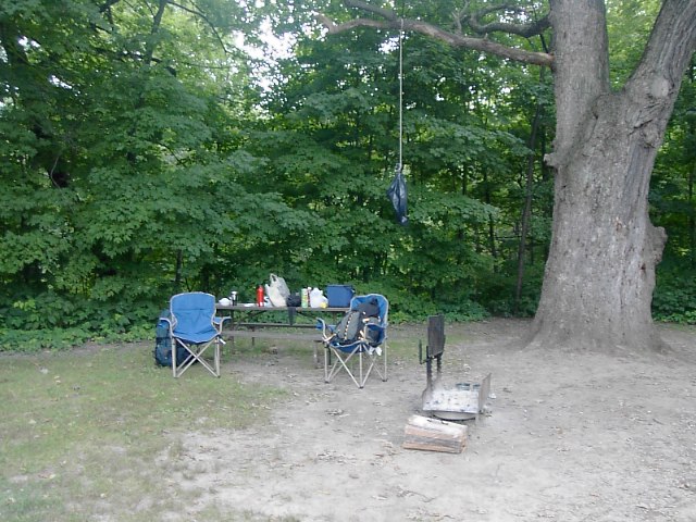 もうひとつは、この白い布、タープです。左側にキャンプのテントはありますが、雨が降ったときの為に広いスペースを確保するための防水性の布をこういう風に張るのです。アメリカでは一般的ではないですが雨の多い日本でタープは欠かせません。このタープ張りはロープワークの技術もあわせて磨くことが出来ます。でないと、タープは風にあおられて容易にとんでいきます。今回は、釣り糸を針につける要領で結び、無事に役割を果たしてくれました。 |