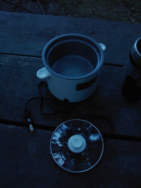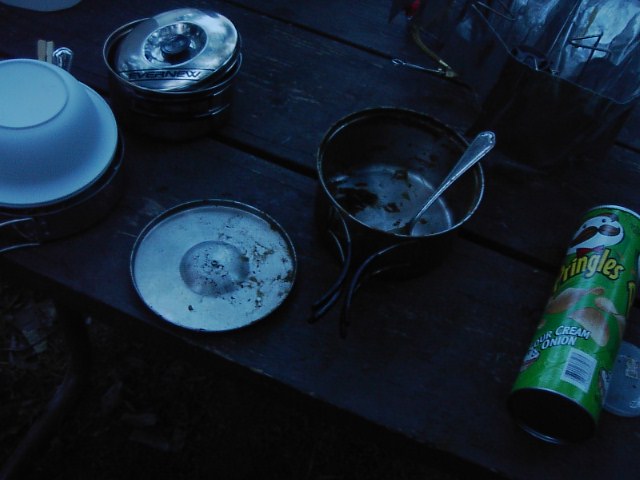 翌朝、仰天したことが起こりました。なんと、カレーと、ご飯の残りが綺麗さっぱり消えてしまったのです!!(驚)前日の晩、食事が終わった時にはすでに真っ暗だったのでご飯とカレーの残りを(先に話した)黒いビニール袋の中に入れてぶら下げずにおきました。ただ単にキャンプサイトにあったテーブルの上においておいたのです。そうしたところが、なななな、なーんと綺麗さっぱりご飯(左)もカレー(右)もなくなってしまっていました。笑。たぶん、Iowa,