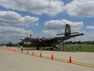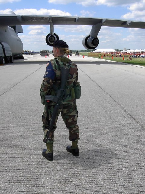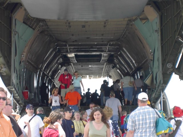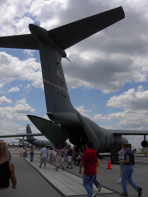 これは輸送機でしょう。超巨大です。ギャラクシーとかいうんだったかな?よく分からんです。。。でかいんですが中はガラガラ、ここに戦車やら、装甲車やらを載せて飛ぶんでしょうね。ちなみにこれも飛行の実演では物凄いジェットを拭いて離陸できることを見せつけてくれました。普通の飛行機とは全く違った離陸をする能力があるんです。デカイだけじゃないんですね。 |