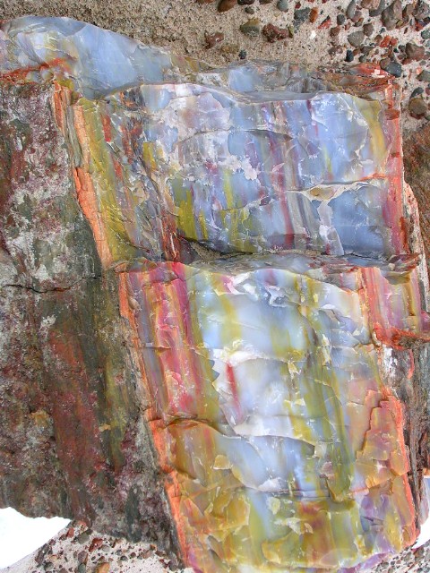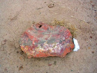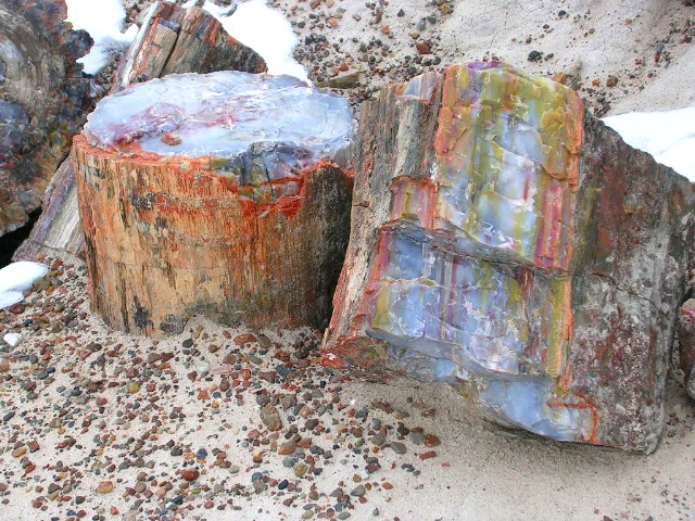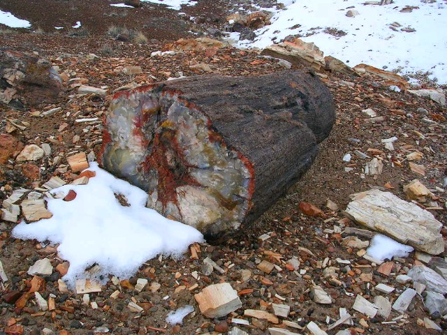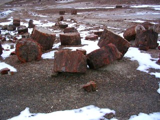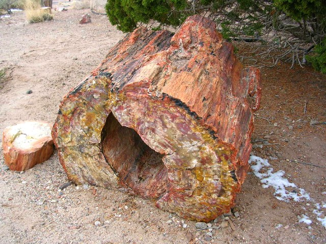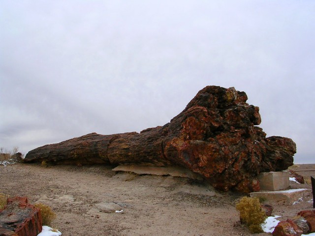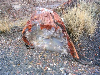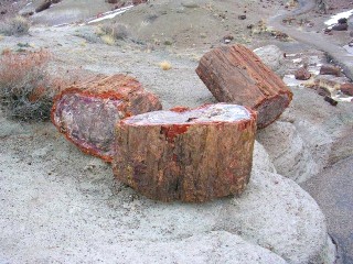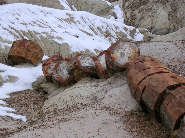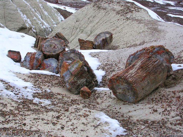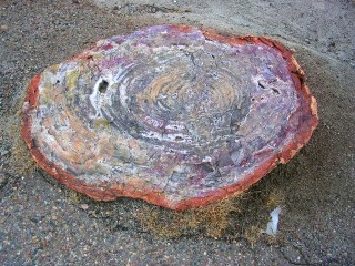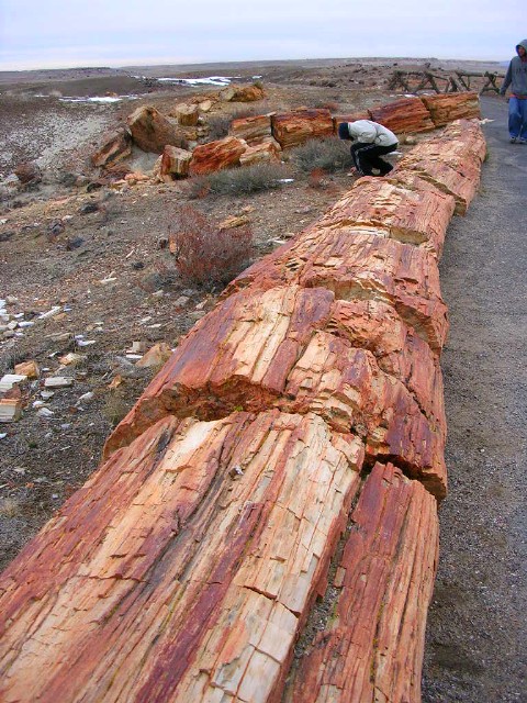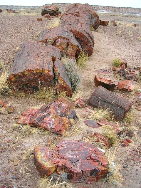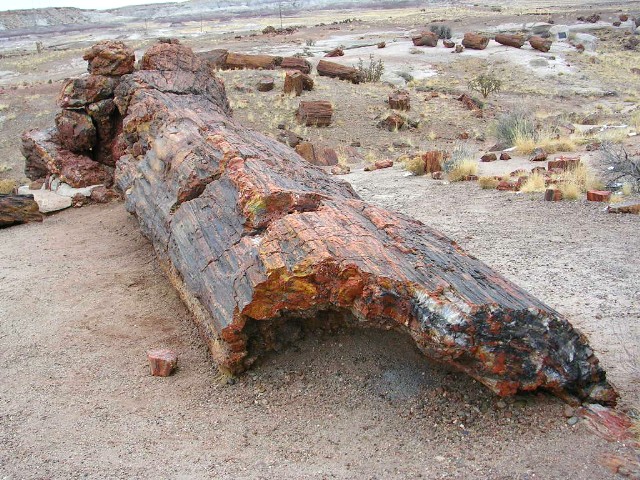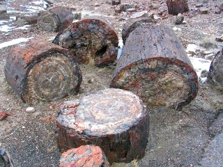 2億年以上も前に、この場所は火山地帯で、かつアマゾン川のような大量の土砂をはこぶ川があったのでしょう。この辺りは川にのって流れてきた倒木が集まりやすい場所だったのじゃないでしょうか。普通なら、倒れた木はすぐ腐ってしまう筈ですが、何故か腐ってしまう以前にこれらの木々は大量の土砂と、物凄い量の火山灰に埋もれてしまいました。その為に腐敗せずに地中に残ることになったようです。 |