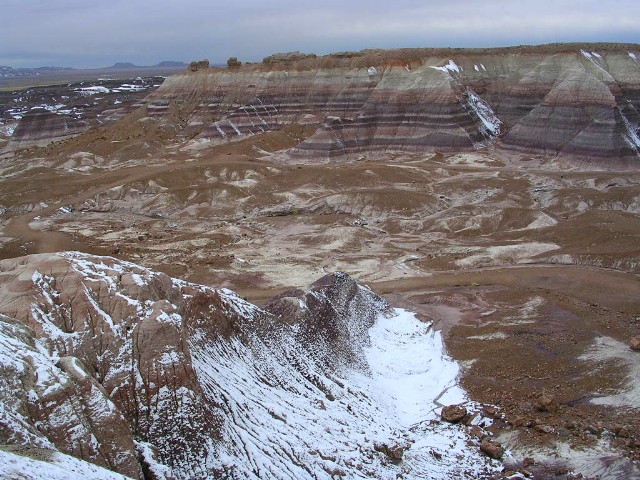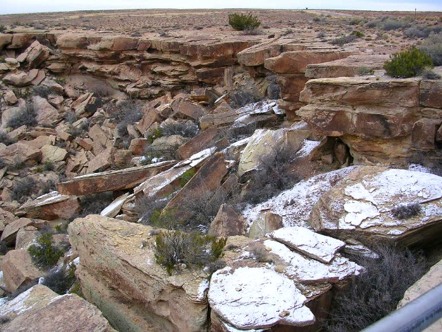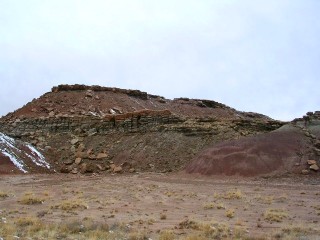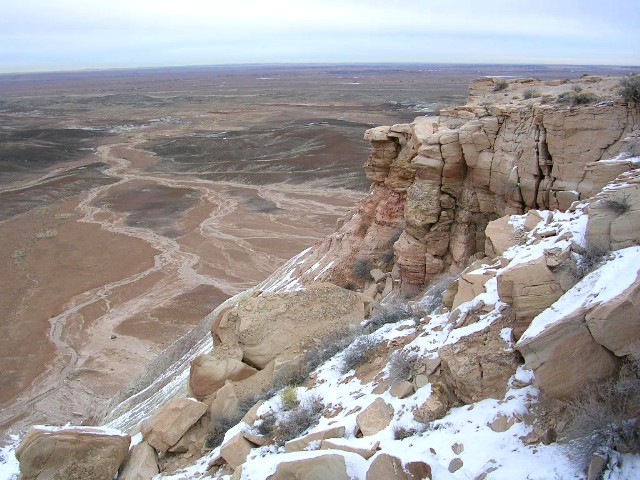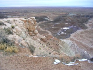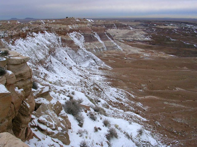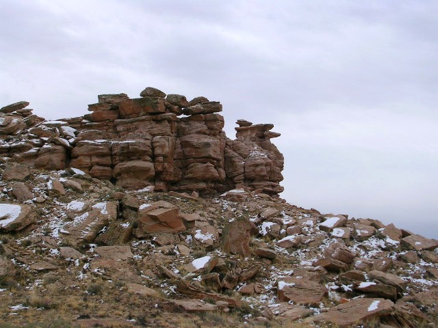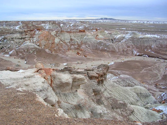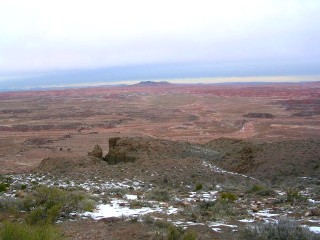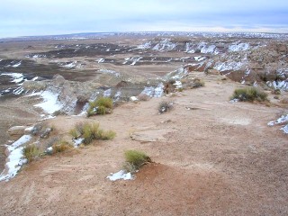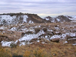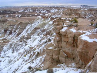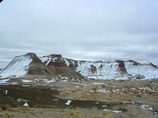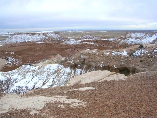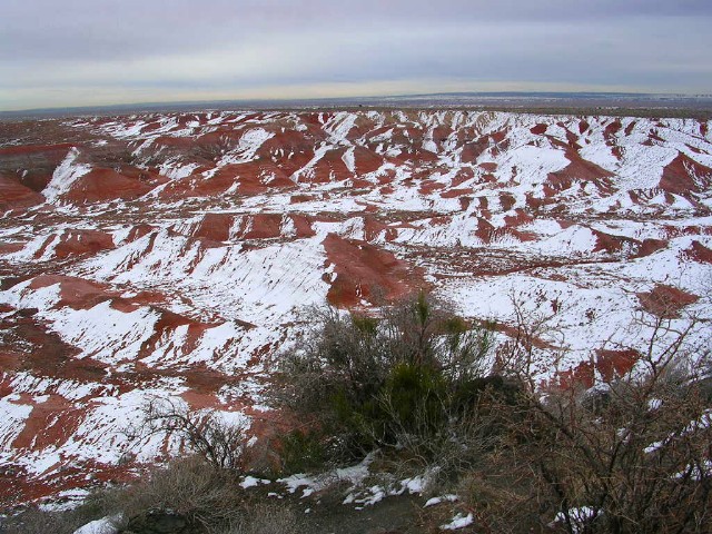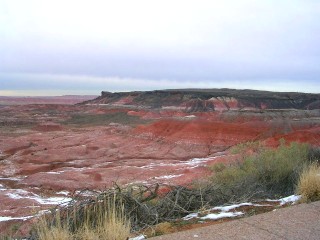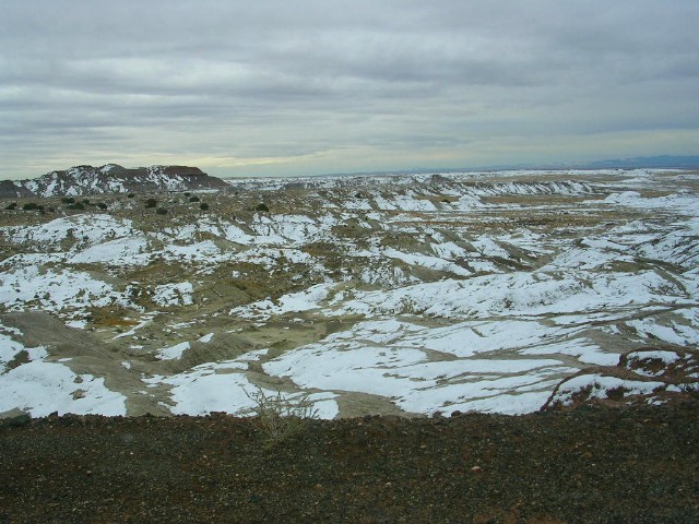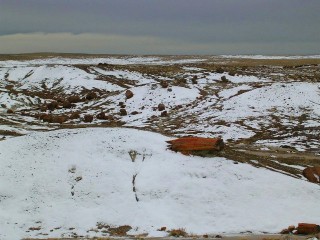 季節は冬で雪が積もっています。赤い大地に白い衣がうっすらかぶって異様な美しさでした。 |
