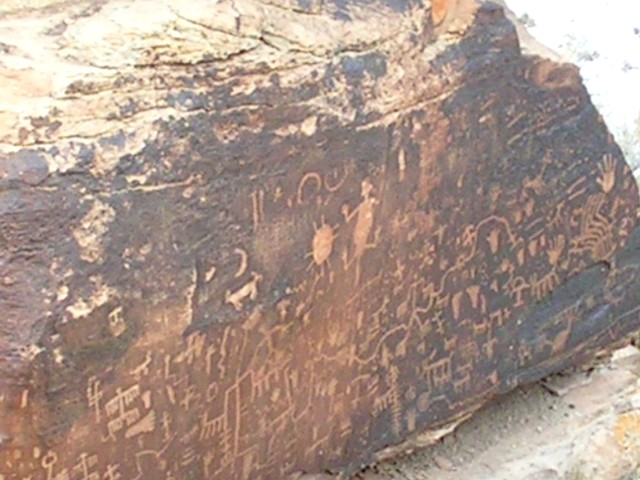 何か解りませんが、絵のようです。これまた人が大昔ココにいたことを証明するものなのでしょう。でなきゃ、宇宙人の仕業でしょうか?笑 ま、ここに住んでいた古代人のなせる業と考えるのが妥当でしょう。さっきの廃墟跡に住んでいた人たちが残したものかもしれません。まったく意味不明ですが、岩に掘り込んででも残したい、言いたいことがあったのでしょう。当時の人は一体何が言いたかったのでしょうか... |