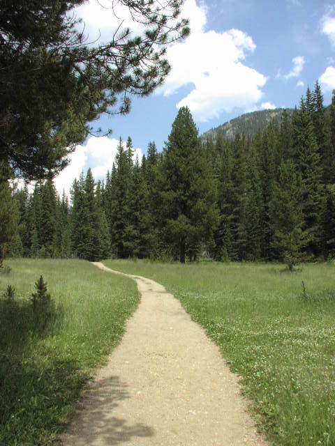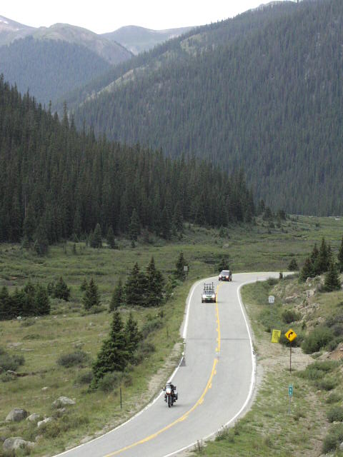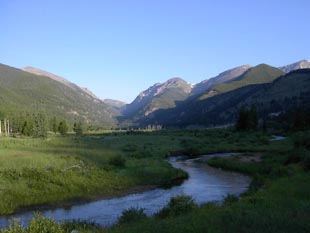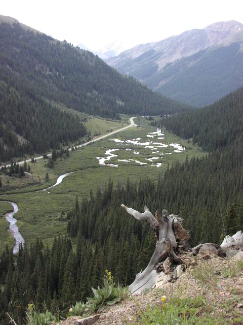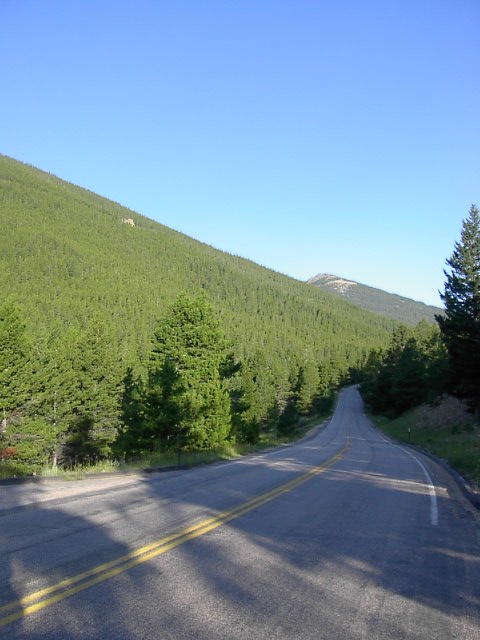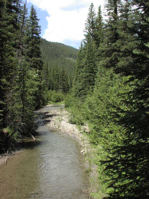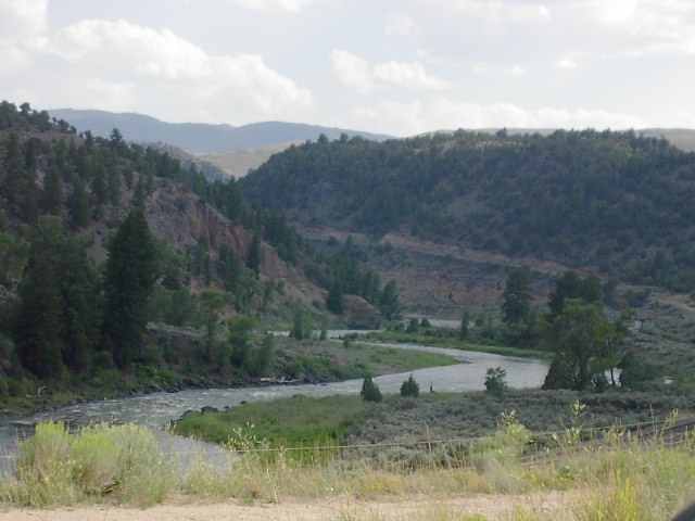 下ってくると、また針葉樹林の森に入ります。これはIowa側から西に向かって山を越えましたので、目の前の川は太平洋側に向かうコロラド川です。ほぼコロラド川源流辺りです。 |