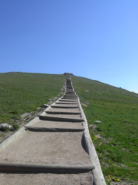 その場所から天に続くかのようなトレイルがありました。チョイト上ります。高度のせいですぐ意気が上がって頭かち割れそうにいたくなりました。軽い高山病です。 |